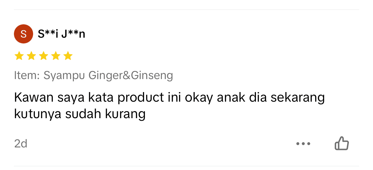 Saya repeat Kali ni. Botol ke 2. Memang berkesan. Saya bnyk kelemumur, sekarang dah berkurangan. Gatal kepala dah tak der.. tq